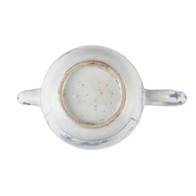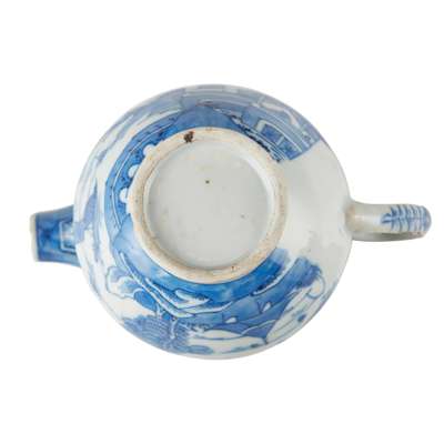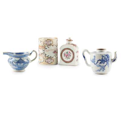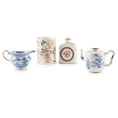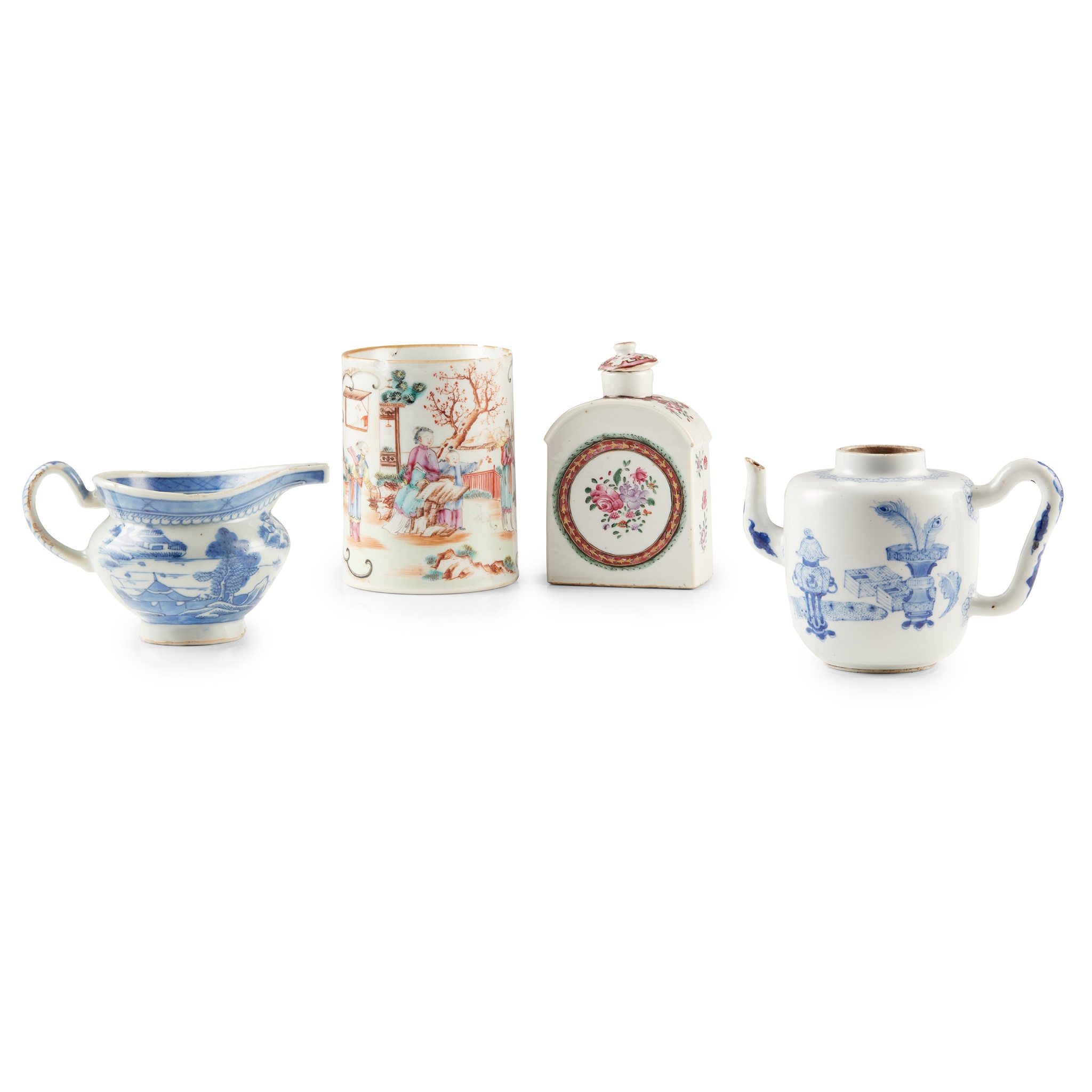 comprising: a blue and white teapot decorated with bogu motif to one side, reverse with bird perching on prunus; a blue and white 'Shanshui and pagoda' milk jug; a famille rose 'figural' tankard; and a famille rose lidded tea caddy