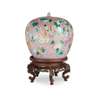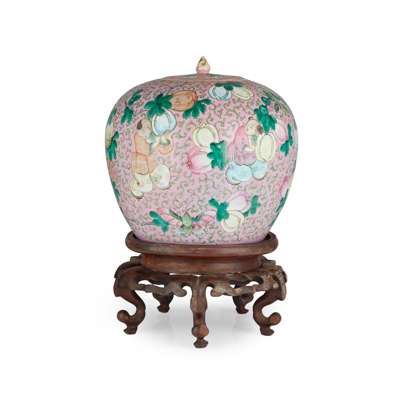 of ovoid form, painted around the body with melons borne on scrolling tendrils, butterflies, and boys all against a pink ground, the cover similarly decorated, on wooden stand