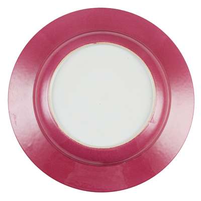 thinly potted, painted to the central medallion with a bearded male figure sitting on a daybed leaning on a stack of books, accompanied by two ladies and a boy, the cavetto with a band of diaper on pink with four rosette cartouches, the underside enamelled in bright ruby-red