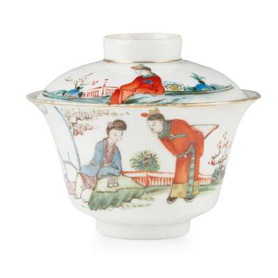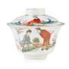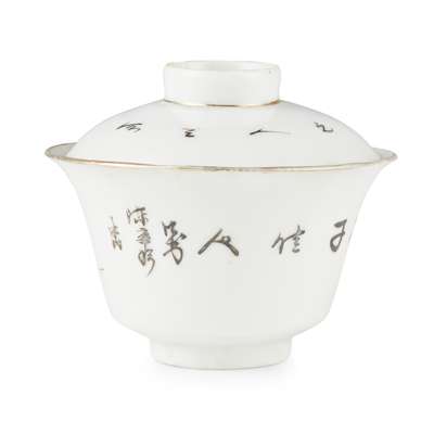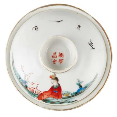 the exterior of the cup painted with Jia Baoyu and a female character from The Dream of the Red Chamber, inscribed 'Cai Zi Jia Ren' (talented young man and great beauty) and signed Chen Huazhen, the base with a seven-character 'Jiang Xi Chen Hua Zhen Chu Pin' (produced by Chen Huazhen in Jiangxi) mark in red stamp, the lid further decorated with the former male protagonist, inscribed, and interior of the finial with a four-character 'Hu Hua Chang Hui' (painted by Hu Huachang) mark in red stamp