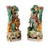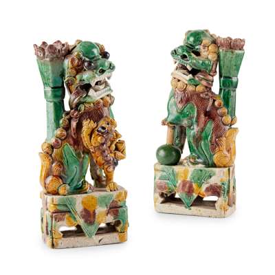 comprising a male Buddhist lion stepping on a ball and a female with a small cub crawling on her leg, each carrying a foliate tube on the back as a joss stick holder and seated on a podium