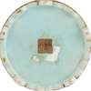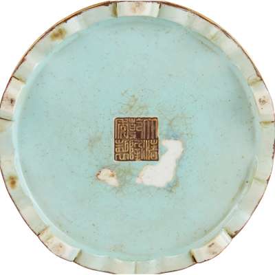 of cylindrical form on five ruyi-feet, decorated in relief with three gilded dragons amongst colourful clouds above ferocious waves, all against a turquoise ground, the base with a gilded six-character Qianlong mark in a maroon-glazed square recessed panel