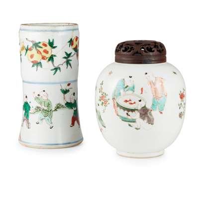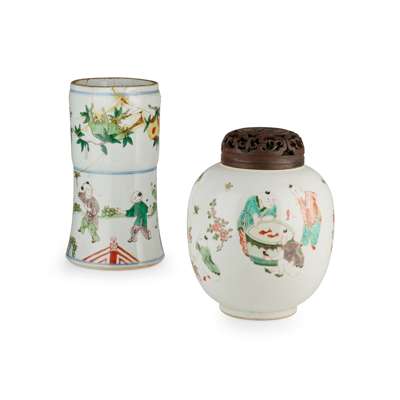 清 五彩嬰戲圖罐及花觚(共兩件)