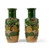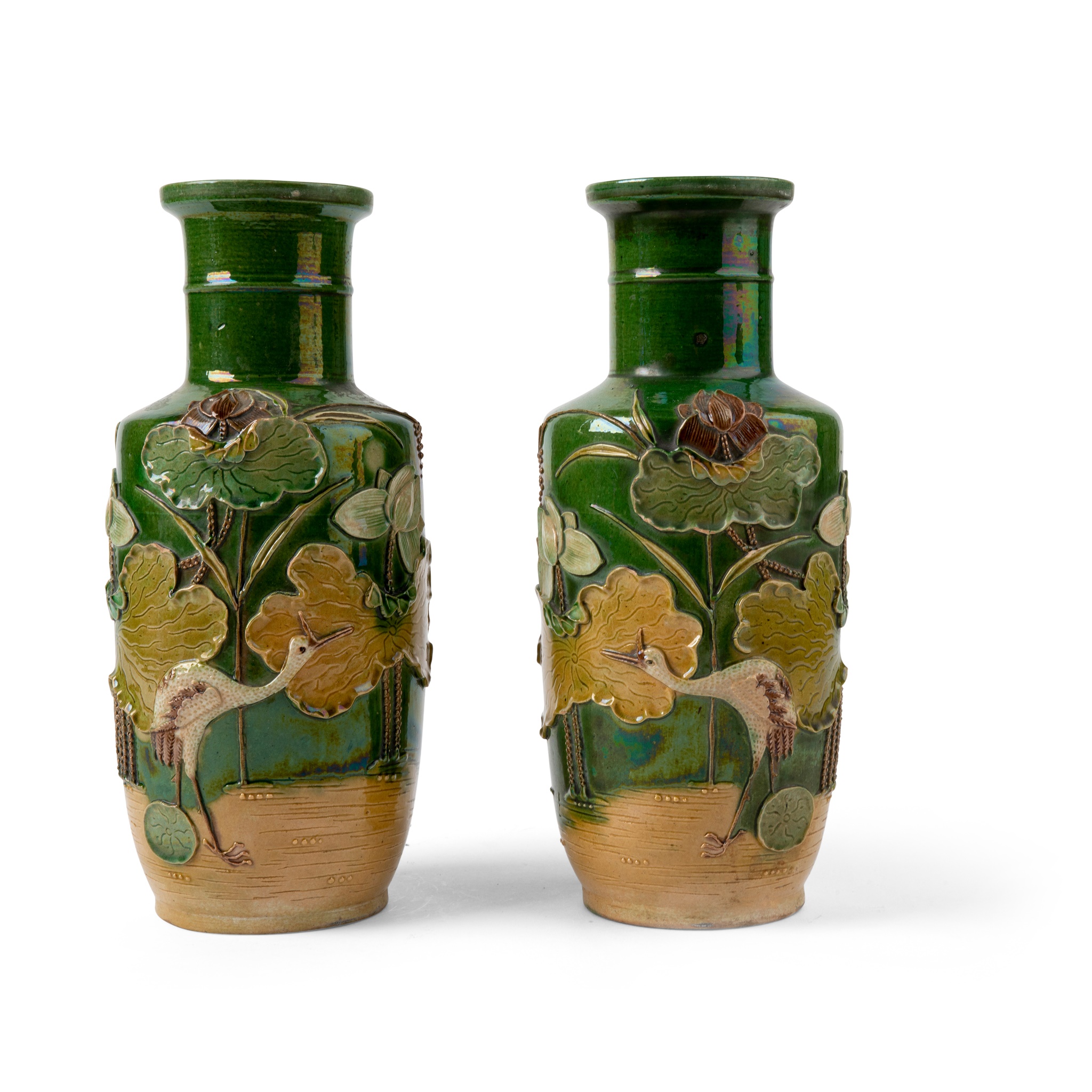 PAIR OF SANCAI CARVED BISCUIT 'CRANE AND LOTUS POND' VASES