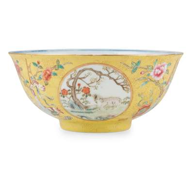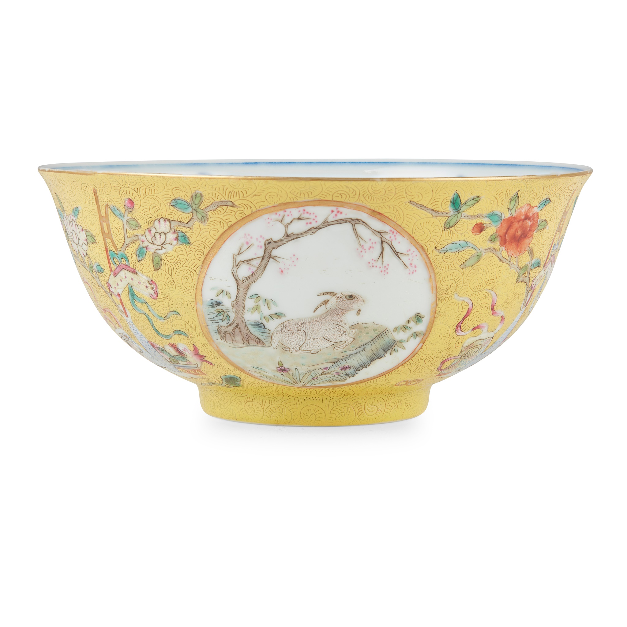 FAMILLE ROSE YELLOW-GROUND SGRAFFIATO 'GOAT' BOWL