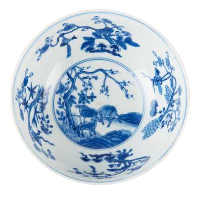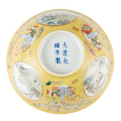 thinly potted with rounded sides and gently flaring rim, decorated on the exterior with three medallions, each enclosing a goat in a landscape, alternating with the arrangement of antiques, all on yellow sgraffiato ground, the interior decorated in underglaze blue with a central medallion further enclosing three goats, underneath floral sprays hung with auspicious emblems, the base inscribed with a six-character Guangxu mark in underglaze blue