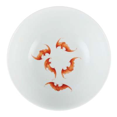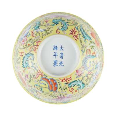 finely potted with deep rounded sides, supported on a short foot to an everted rim, the exterior delicately painted with various flowers in tendrils against a yellow-glazed ground, the interior painted with five flying bats in iron-red, the base inscribed with a six-character Guangxu mark in underglaze blue