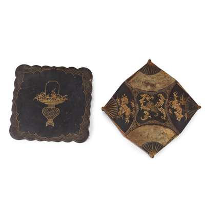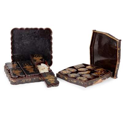 十九至二十世紀 黑漆描金花籃、扇紋套盒兩件(帶數小盒、含百餘螺鈿游戲芯片)