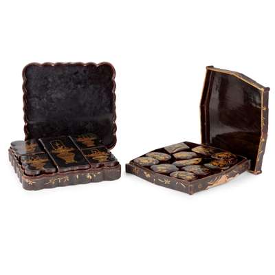 one of lobed square form, painted on the cover with ikebana, containing five smaller similarly decorated fitted boxes, some further containing mother-of-pearl and bone games counters; the other with four opened fans on each corner forming a squarish form, detailed with gilt, the interior containing eleven assorted shaped kobako (small boxes)