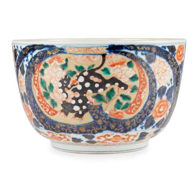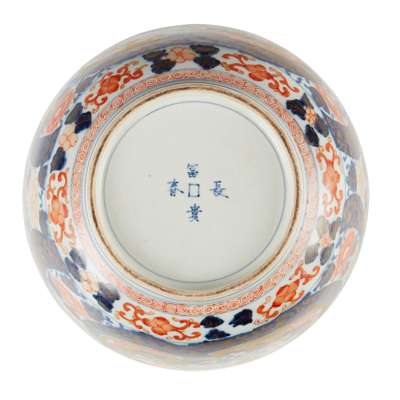 明治 富貴長春款 伊万里花卉瑞獸紋大碗