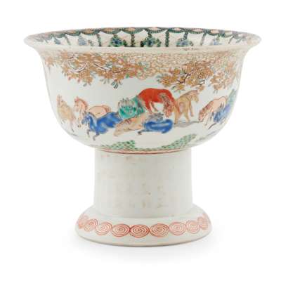 supported on a tall stepped foot, the cup terminating into an everted rim, the exterior of the cup finely painted with One Hundred Horse design, the centre of the interior adorned with a male immortal riding a phoenix in flight, all surrounded by beaded jewel strings and tassels with flower heads on the cavettos, the stem fully written with calligraphy in gilt
