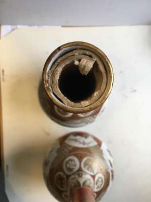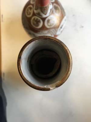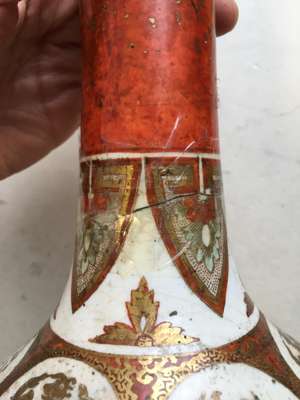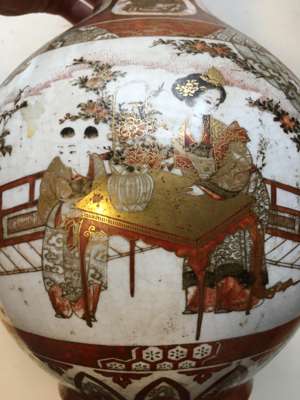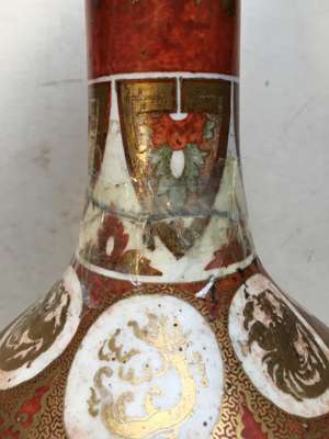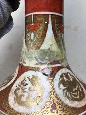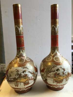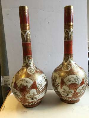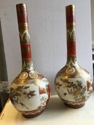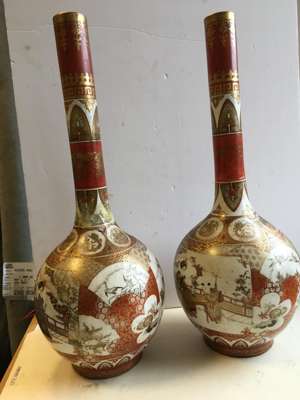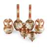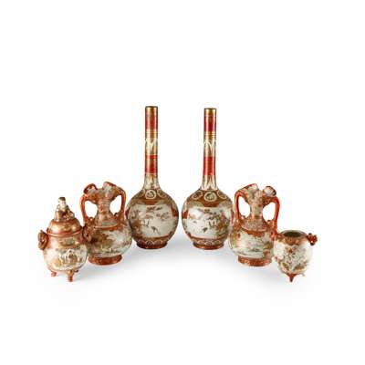 comprising: a pair of large bottle vases, each base marked; a pair of two-handled vases, each base marked 'Kaga Kutani, Nishikino zo, ? ga'; two tripod koros, one with a dome lid topped with a moulded jorujin with deer, the base marked 'Kutani', the other marked 'Nishikino'