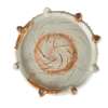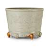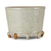 the cylindrical censer stands on eight decorative cabriole legs, the exterior carved in relief with four large lotus between the lipped mouth rim and a band with raised dots above the base, covered overall with an even sea-green glaze, leaving a circular band on the base unglazed