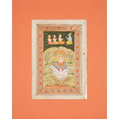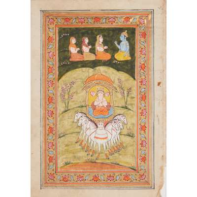 folio from a dispersed manuscript, gouache on paper, heightened in gold, depicting Surya in a bejewelled carriage drawn by seven horses, floral border