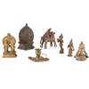 comprising three figurines including Krishna in a fluting gesture, seated Vishnu, and another Hindu Goddess; a shrine with a lotus back with two male attendants; an elephant on wheels with rider; an alms shrine in the form of a lotus surmounted by a seated Buddha; and two candle holders