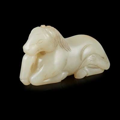 in the recumbent pose, with legs tucked underneath its body and only the right front leg half raised against the ground, its head finely defined in low relief with mane and pricked ears, the bushy tail wrapped around its left hind, the stone of even celadon colour with a patch of russet skin on its rear hind
