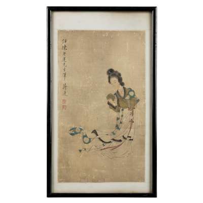 清 蔣蓮 美人捧香爐水墨畫 設色絹本 鏡框