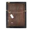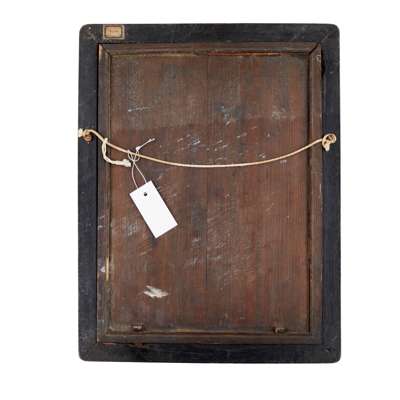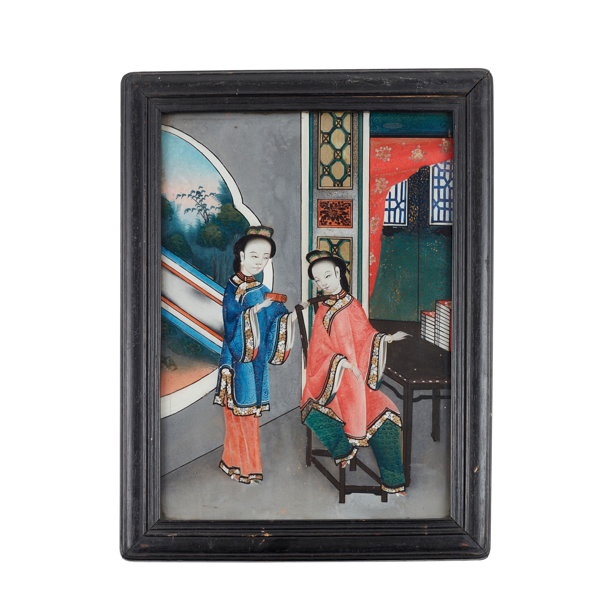 depicting a seated lady leaning slightly towards the right to a standing lady holding a scroll in a room with a wall with a large shaped window, centre of the room with a divider panel further with red cloth to the right, framed