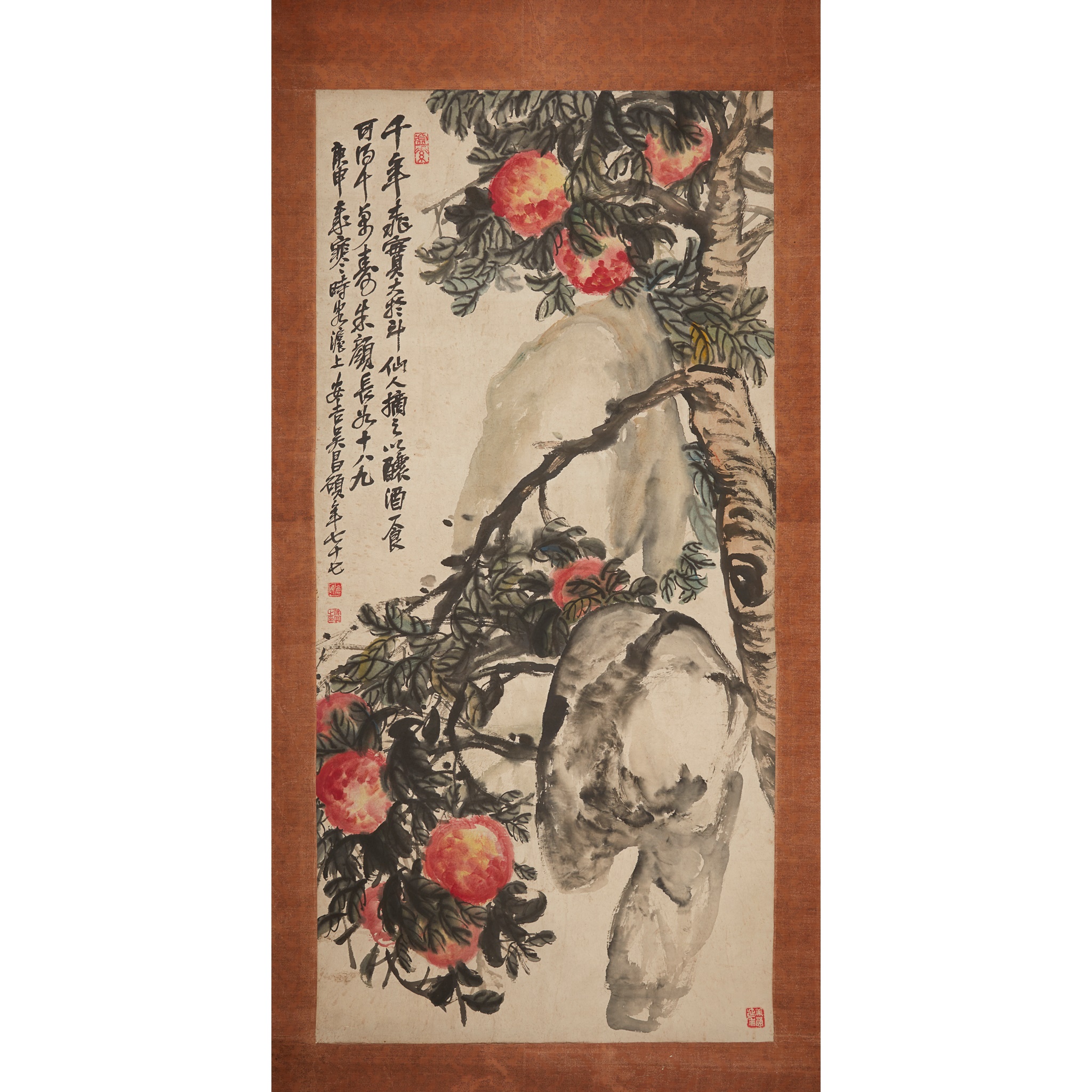 款識: 千年桃實大於鬥/仙人摘之以釀酒/一食可得千萬壽/朱顏長如十八九/庚申年寒時客滬上/安吉吳昌碩年七十七