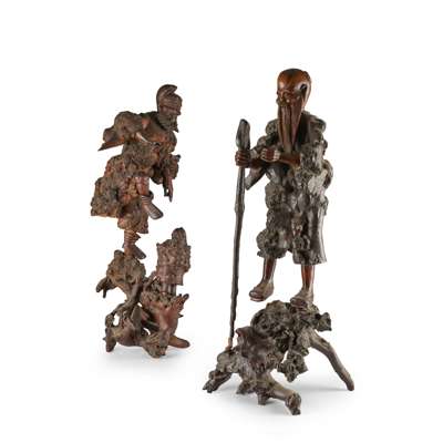 one depicting a deity standing on one leg slotted onto a carved and assembled naturalistic gnarling wood, his left hand with two fingers pointing down to a smaller figure, the other depicting a male bearded figure holding a long staff on a gnarling root wood, both set with dark glass eyes