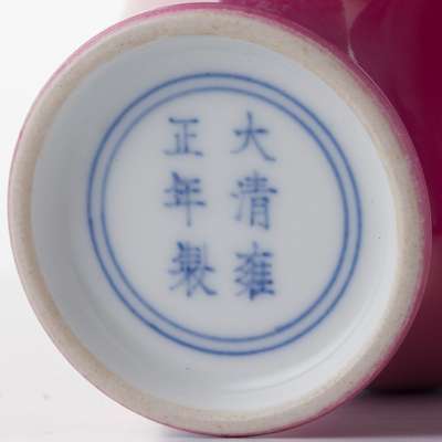 comprising: a turquoise-glazed meiping vase, decorated on both sides with carved and moulded floral motif, 32.8cm high; a flambe-glazed meiping vase, 20cm high; and a ruby red glazed ovoid vase, the base inscribed with a six-character Yongzheng mark within two circles in underglaze blue, 16.2cm high
