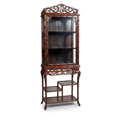 the top with central triangular pediment and side panels carved and pierced with entwined bamboo and leaves, the vitrine glazed door opening to three-tiered wooden shelves, on a separate base with a waisted and splayed apron each further carved and pierced with bamboo on cabriole legs joined by asymmetrical display shelving