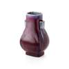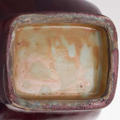 of rectangular section with indented corners, the neck flanked by a pair of rectangular lugs, two main sides of the body each with a peach-shaped cartouche, covered overall with thick glaze of dark red tone streaked with lavender, turquoise, and cream, the base incised with a six-character Qianlong mark