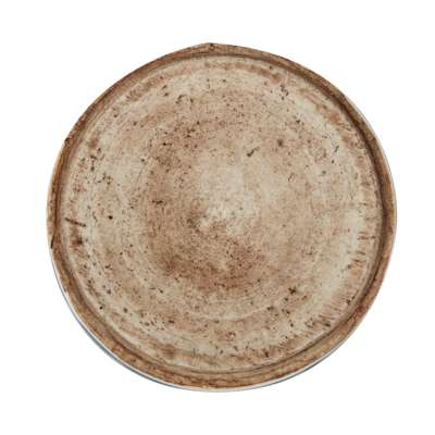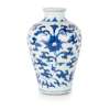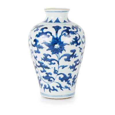 sturdily potted to a wide shoulder and terminating to a flared mouth rim, the body painted with flowers in leafy tendrils, all below two circular bands on the shoulder and above the base, the neck further decorated with triangular pattern, the mouth rim covered with brown glaze