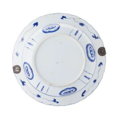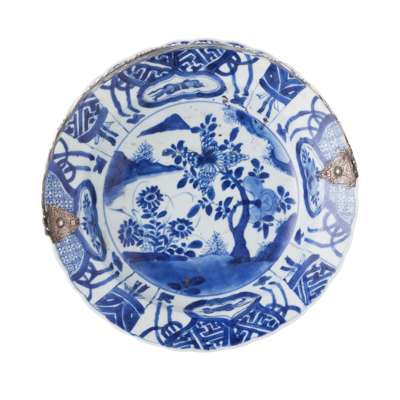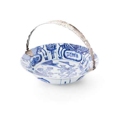 thinly potted, painted in the central medallion with flowering branches and flowers, the mouth rim set with a later openwork white-metal handle, marked 'HS195'