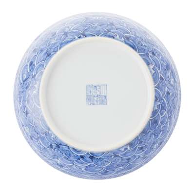 painted in the central medallion with a Ming-style coiling dragon against swirling waves, the exterior further with nine dragons on similar ground, the base inscribed with a six-character Qianlong mark
