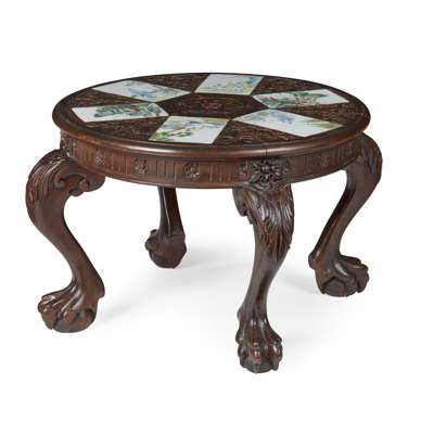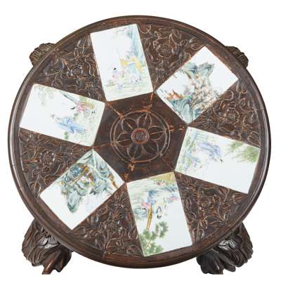 four finely painted with scholar with a boy attendant and two with shanshui landscape, all inset on the top of a carved wooden table