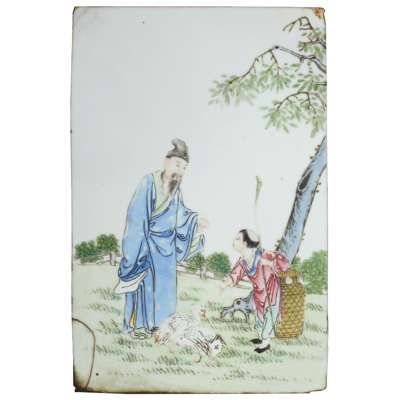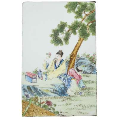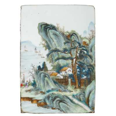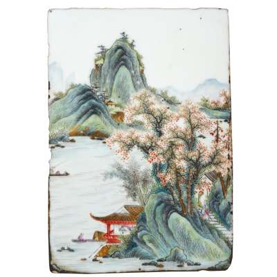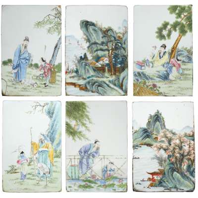 二十世紀 粉彩山水人物紋瓷板 共六件 嵌木桌