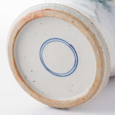 one vase painted overall with small figures in a mountainous landscape, the other vase decorated with a large pheasant roaming amongst blossoming chrysanthemums, both vases decorated on a fine craquelure glaze, whilst the necks with a raised ridge and the mouth rims with metal mounts, the vase with flowers has an underglaze blue double-circle on its base