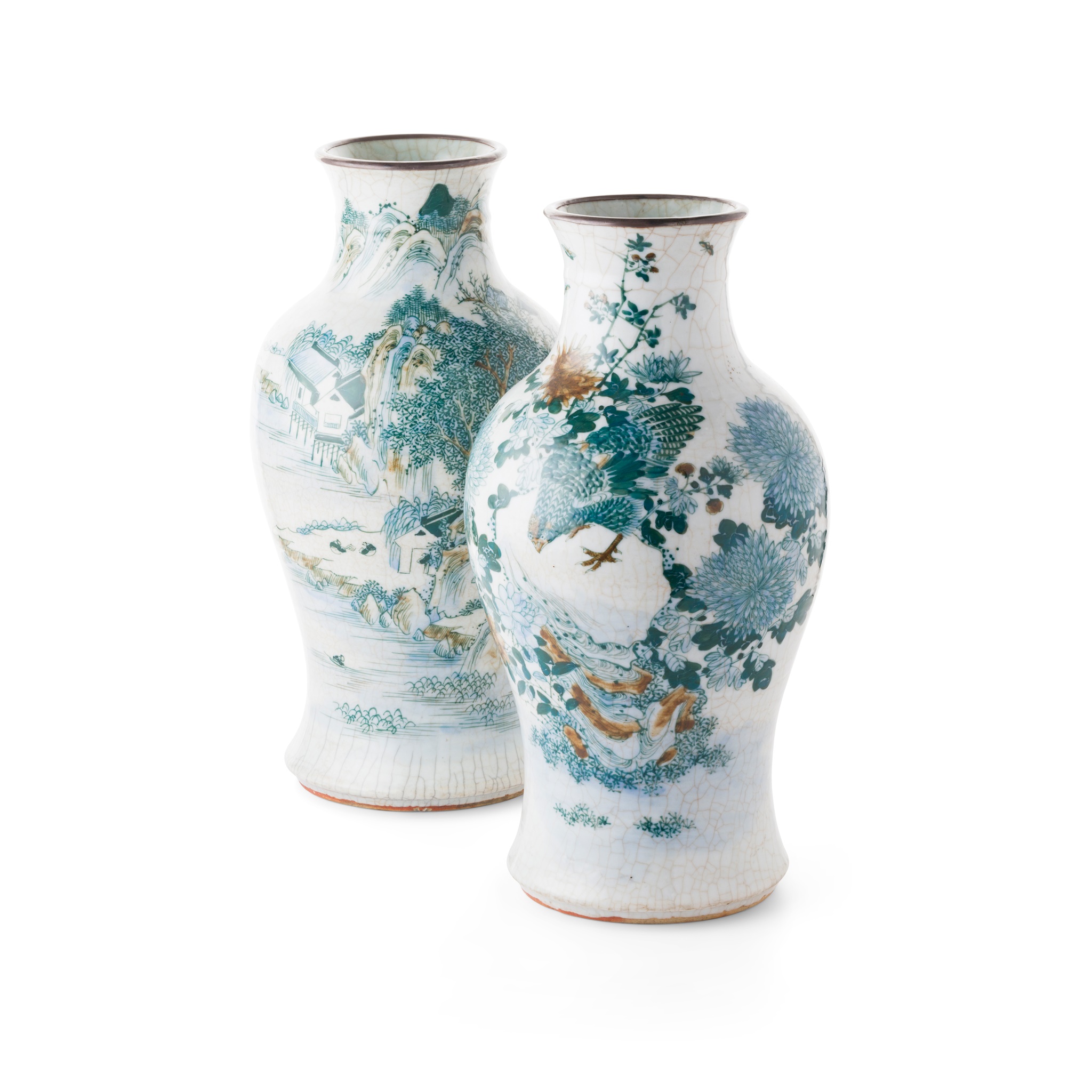 十九至二十世紀 哥釉綠彩山水人物紋瓶 及 雉雞菊花紋瓶 (共兩件)