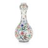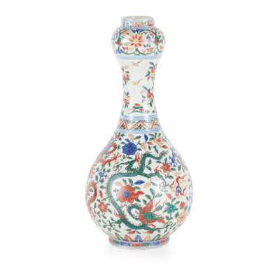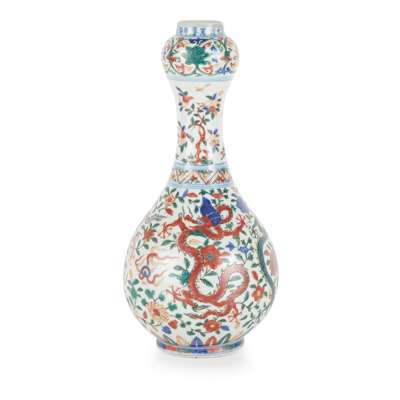the sturdily potted pear-shaped body supported by a short straight foot, rising to a garlic-bulb shaped mouth, the main body decorated in the wucai palette including iron-red and vivid purplish underglaze-blue, painted with two pairs of ferocious dragons, each pair in mutual pursuit of a 'flaming pearl' amid scattered flowers on meandering leafy stems, beneath a band of upright and pendant triangles containing trefoils at the shoulder, the slender neck with birds flying among fruiting shrubs, the garlic-bulb mouth with multi-colour lotus scrolls, the rim inscribed with a six-character mark in underglaze-blue in a cartouche reserved on a foliate band