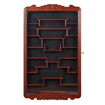 upper border of the door carved with key-fret and lower with stylised dragons, opening up to irregular stepped panels forming the compartments