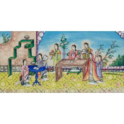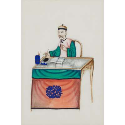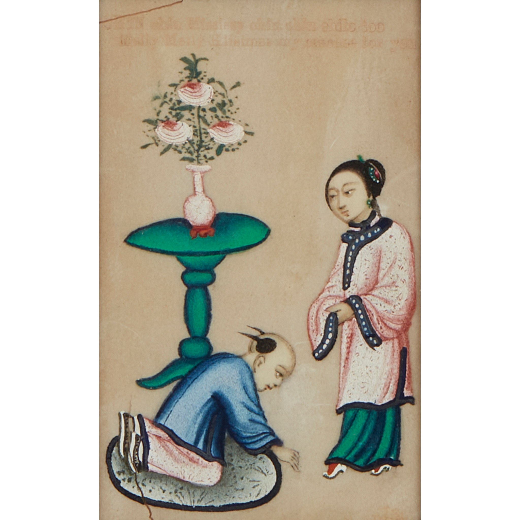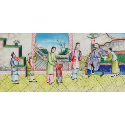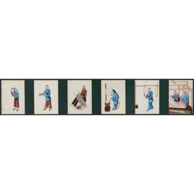 gouache on pith paper, a set of six in one frame depicting various occupations, two vertical depicting domestic courtly scenes, other nine with figures in various activities
