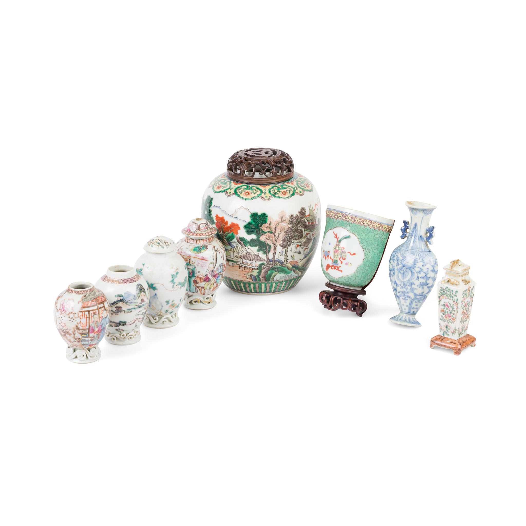 comprising: a famille verte ginger jar with wooden cover, the base painted with double-circle in underglaze blue; four small famille rose baluster vases; a famille rose four-section vase with 'wood-imitation' base; a green-ground famille rose wall vase, with fitted stand; and a blue and white wall vase