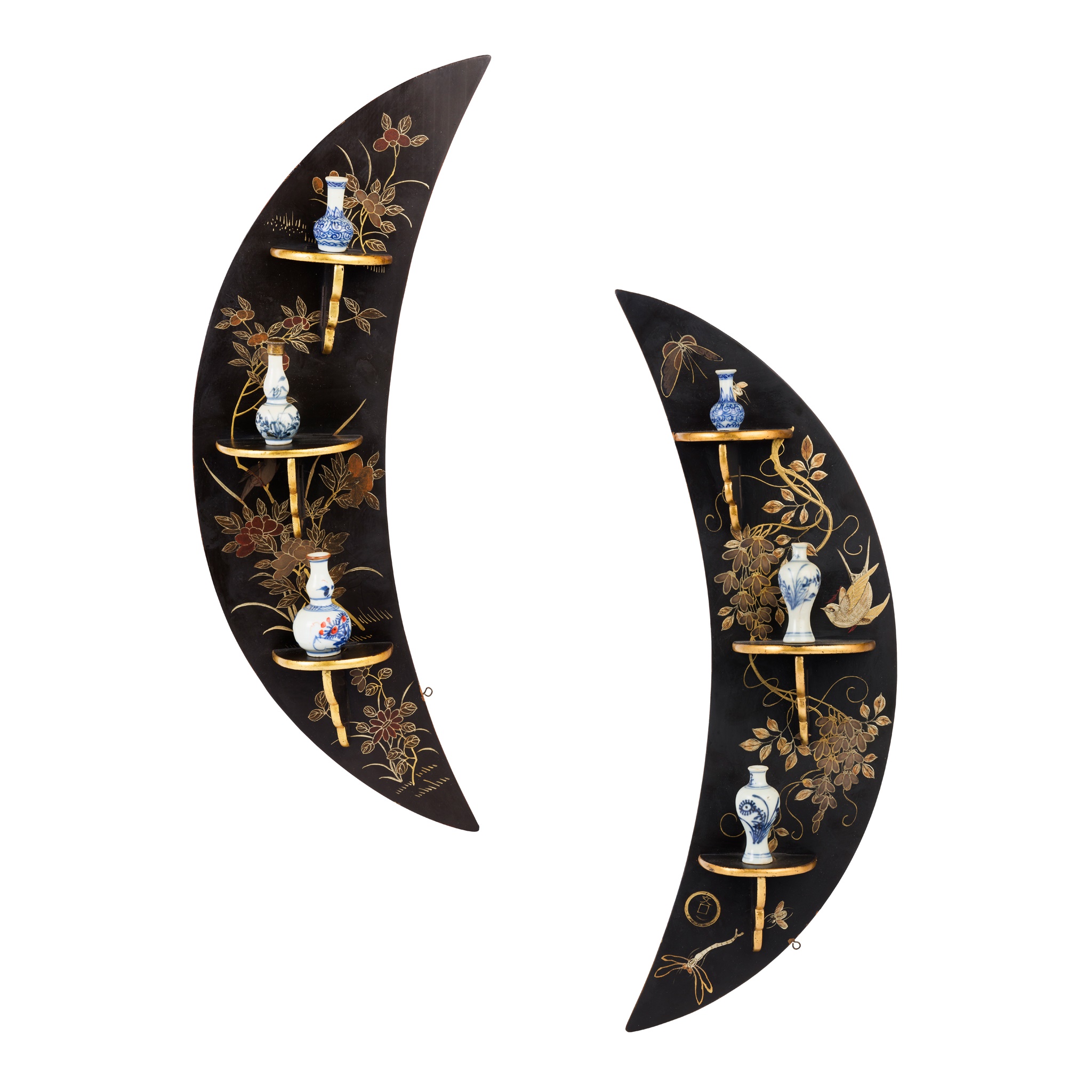 comprising: two of meiping, two of bottle, and two of double-gourd forms, the largest double-gourd vase with iron-red details, all on two later Japanese wall mount gilt-decorated crescent-shaped display stands