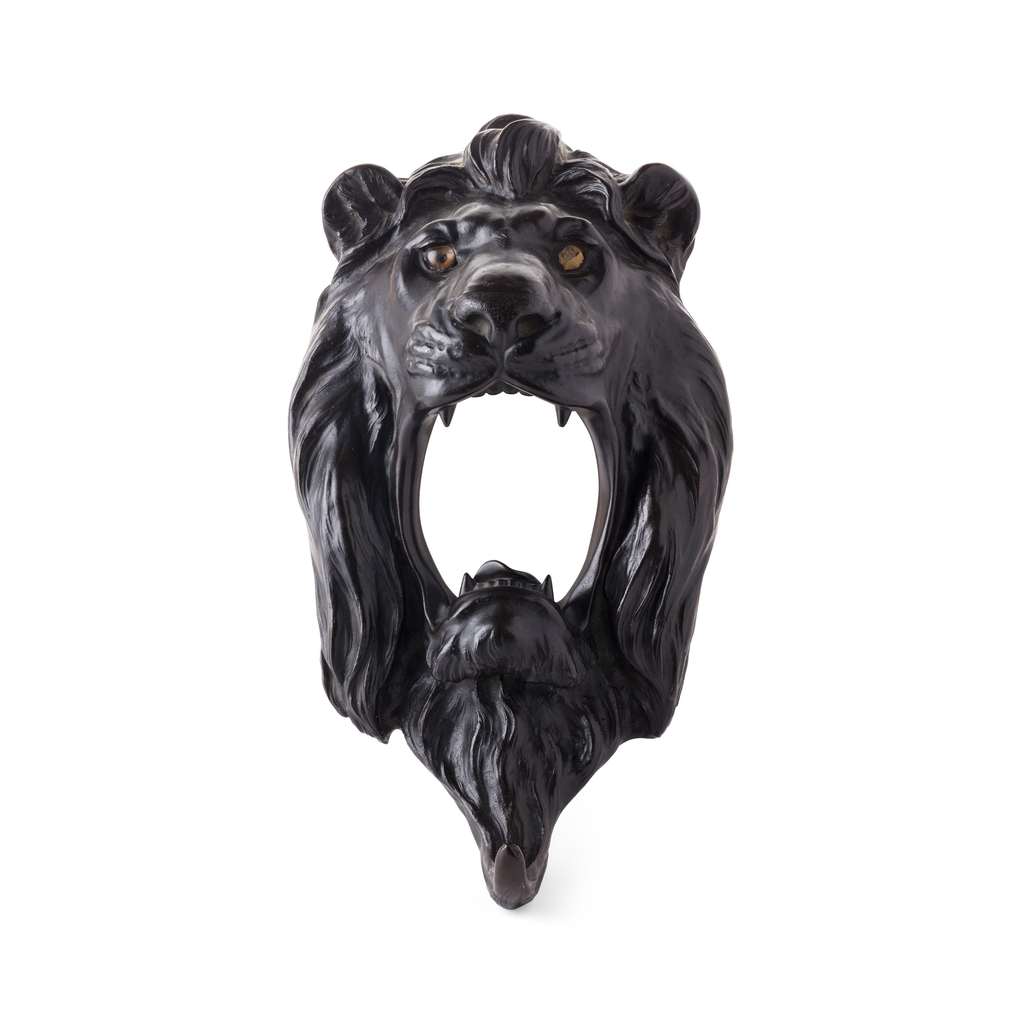 cast as a roaring lion, mouth opened with two adjustable joints at the back of jaw, lower mane upturned as coat hook, signed 'Mitsumasa Sei' on right margin, further marked on left margin in a panel