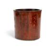 of subtly tapered cylindrical form raised on three stud-feet, engraved and featured in red with a poem entitled 'Bamboo in the Rocks', signed Zheng Banqiao (aka Zheng Xie, 1693-1765), the reverse carved with green-painted bamboo grove issuing from rocks