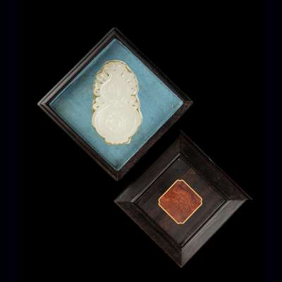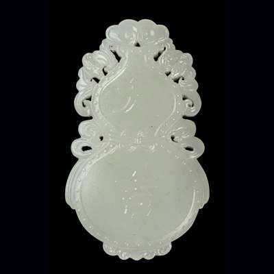 of double-gourd form tied with a ribbon and flanked by two bats, topped with a ruyi-cloud, one side of the smaller upper bulb with 'Da', lower 'Ji' forming 'auspicious', the stone of even translucent white tone, in a fitted wooden box