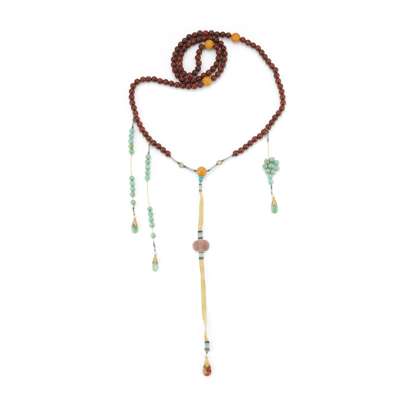 comprising one hundred and eight horn-carved beads, every twenty-seven spaced with larger yellow-coloured beads, the main tassel with a translucent purple plaque and waterdrop shaped agate, turquoise beads further on auxiliary tassels and suspending jadeite pendant drops