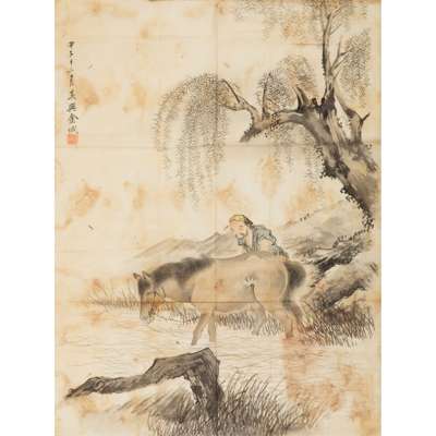 ink and colour on paper, depicting a man washing a horse in a river underneath a large willow tree, signed on the top left with 'Wuxing Jin Cheng', a red seal 'Jincheng', and dated to the twelfth month of Jia Zi year, corresponding to 1924AD