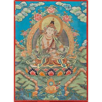 distemper on cloth, shown seated in dhyanasana on a single lotus throne, right hand raised in karanamudra holding an upright vajra, left hand holding a ghanta before the abdomen, billowing scarfs wrapped around her shoulders and arms, decorated with elaborate bracelets and armbands, large earrings flank the serene face, crowned, enclosed by natural surroundings with turquoise sky, verso inscribed and sealed