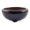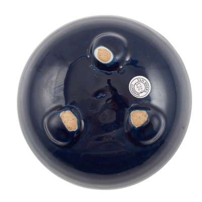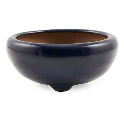 covered in deep blue glaze on the exterior, the interior dressed in brown glaze, the bases of the feet unglazed revealing the brown stoneware body