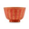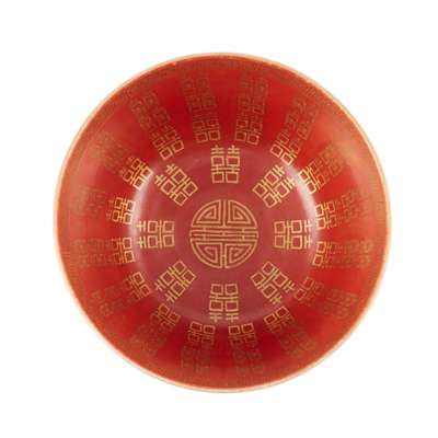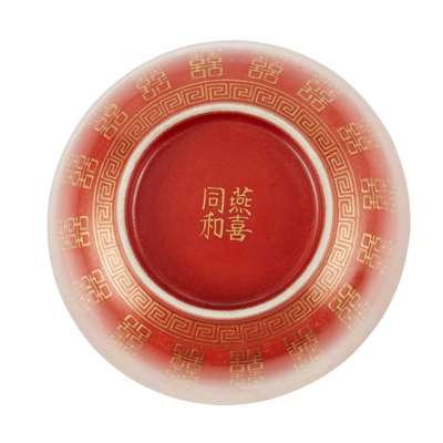 清 燕喜同和款 珊瑚紅釉描金'囍'字碗