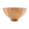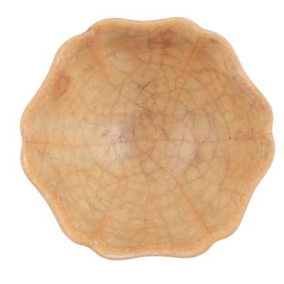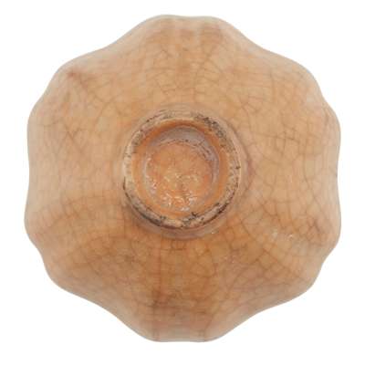 sturdily potted with steep ribbed sides rising to foliated mouth, covered overall with a thick reddish brown glaze suffused with a network of white, russet, and black crackles