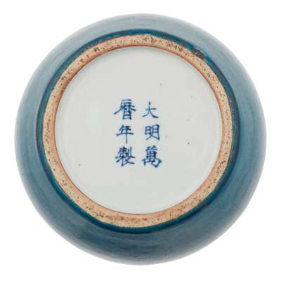 decorated with scrolling lotus with tendrils, covered overall in a brilliant turquoise-blue glaze pooling to a deeper turquoise in the carved recesses to accentuate the design, the base inscribed with a six-character Wanli mark in underglaze blue