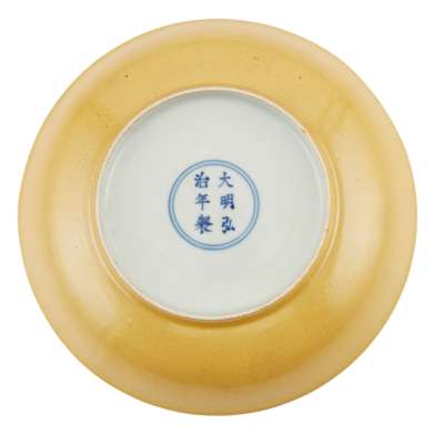 with gently flared rim, the yellow glaze covered inside out, the base inscribed with a six-character Hongzhi mark in underglaze blue